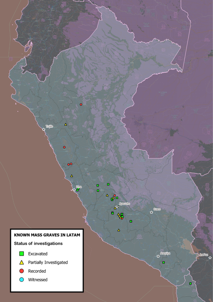 The Peruvian Truth and Reconciliation Commission (TRC) established that approximately 69000 people, both civilians and combatants, died in twenty years of war between the Peruvian security forces and the guerrilla groups Shining Path and Túpac Amaru Revolutionary Army (MRTA). During the armed conflict, Peruvian security forces committed grave abuses including many that constitute war crimes, such as extrajudicial executions, enforced disappearances, torture, sexual violence, and other serious human rights violations. The TRC documented more than 4,600 graves, of which 2,200 were allegedly subjected to preliminary investigations, but less than 30 cases were made public in the same document. With a great effort, MaGPIE was able to document 42 mass grave sites in Perú through open sources, which constitute less than 2% of the allegedly investigated mass graves. The data is fragmented, incomplete, and not easily available.